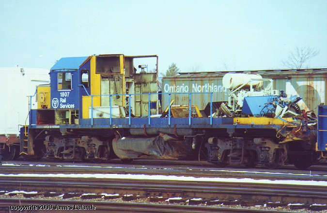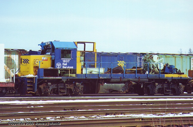 | Wreck | 1807 GP-38-2 - All torn up in wrecking line. | North Bay | Mar '00 | James Lalande |