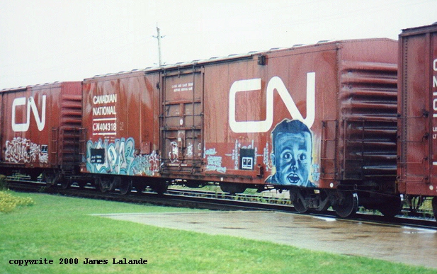 | cnbox | Part of a southbound train, a CN boxcar with interesting graffiti. | North Bay | Sep '99 | James Lalande |