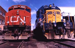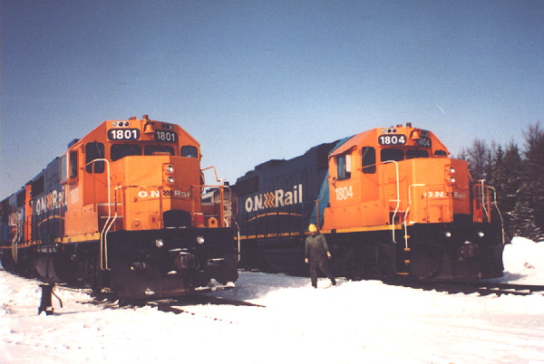 | New/Old | GP-38-2 - 1801 sits newly painted in fornt of rusty GP-9 1604.(r@NB) | North Bay | Mar '99 | James Lalande |