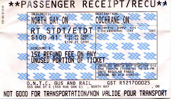 | Stub | Ticket stub from North Bay to Cochrane | N/A | Nov '00 | A.J.M Landry |
